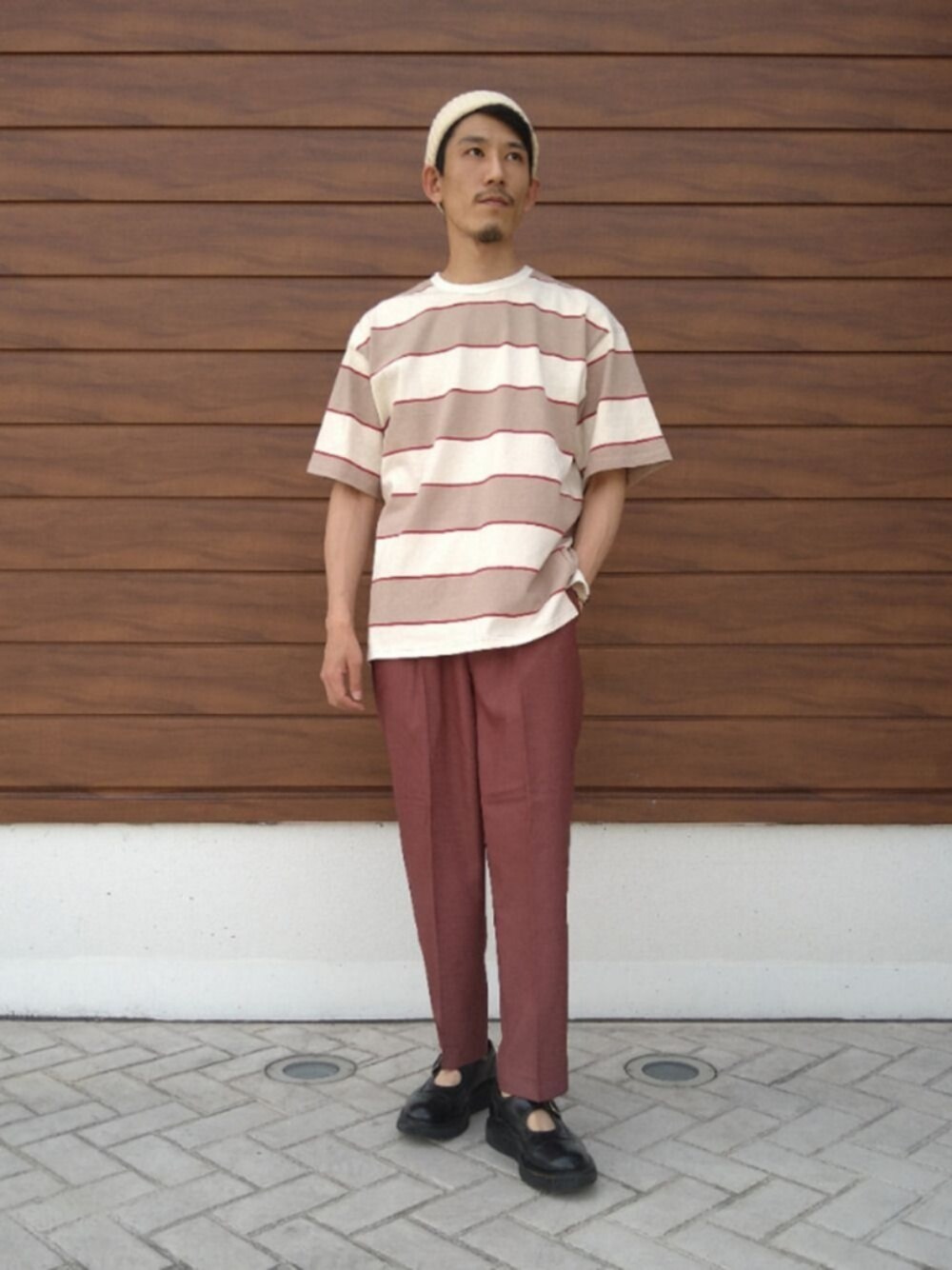 ピッチ幅の太いボーダーって子供っぽくなりがちですけどこれはかなりこなれた配色で着やすいです。 まんまデニムなどで合わせるのではなくセンタープレスのパンツで小綺麗に。