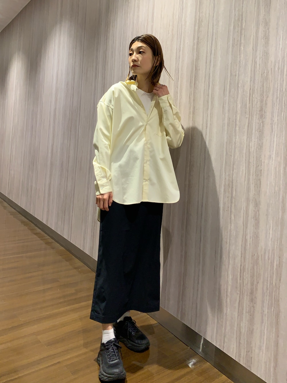 EKALのコーディネートです。 トップスは、一枚着るだけで春らしく明るい雰囲気が出る、ビッグシャツです。 ボトムは、高身長には長め丈が嬉しい、タイトスカートです。 ストレッチもあり、使い心地もオススメします!