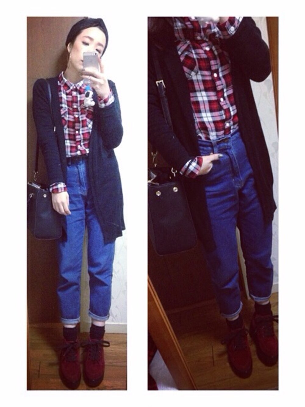 チェックシャツイン秋葉スタイルに ロングカーディガンを添えて笑