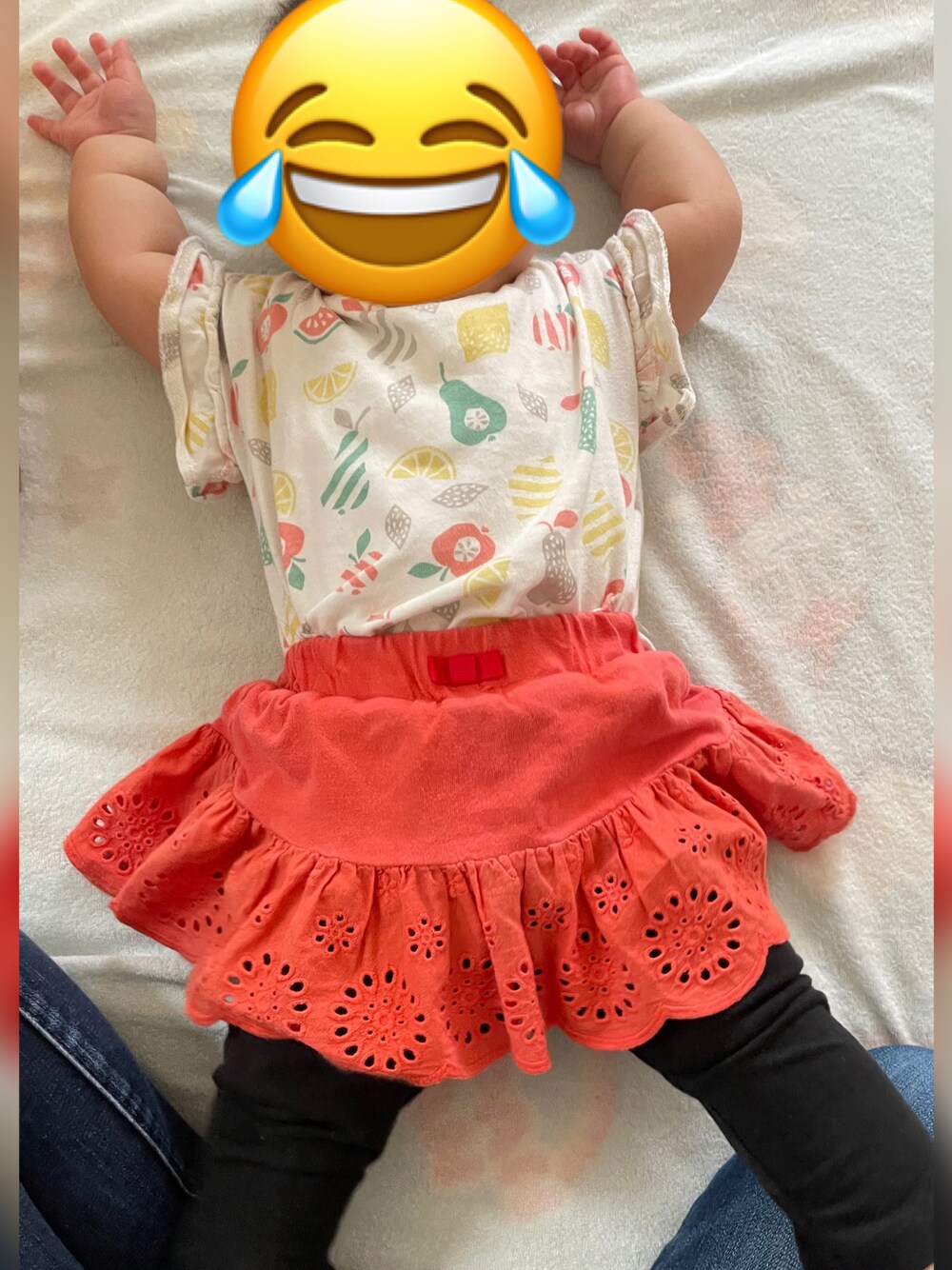 6娘6ヶ月。 気温20度前後のコーデ。 スカートと黒のズボンはセットになってるので可愛い★でも赤のスカートは上の服を選ぶの難しい! 写真は置かれてめっちゃ泣いてる時(笑)