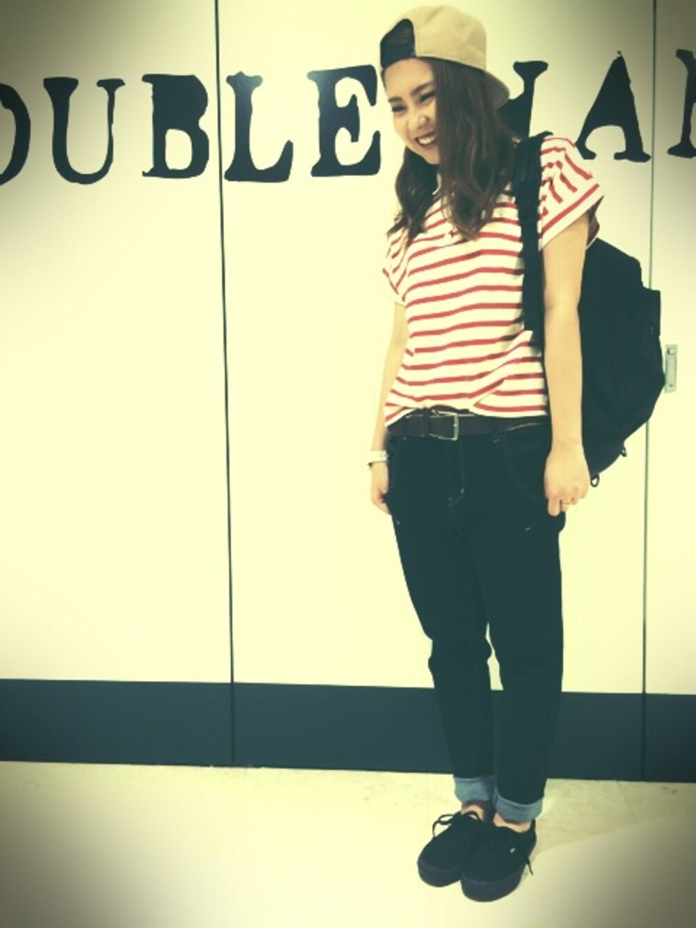 またまたボーダーです。笑 赤ボーダー可愛いですよね♥️ カットデニムサルエルパンツが履きやすくて美脚に見えてもう最高のデニムなんです♥️ 大好きなボーダーとパンツでこの笑顔です。笑