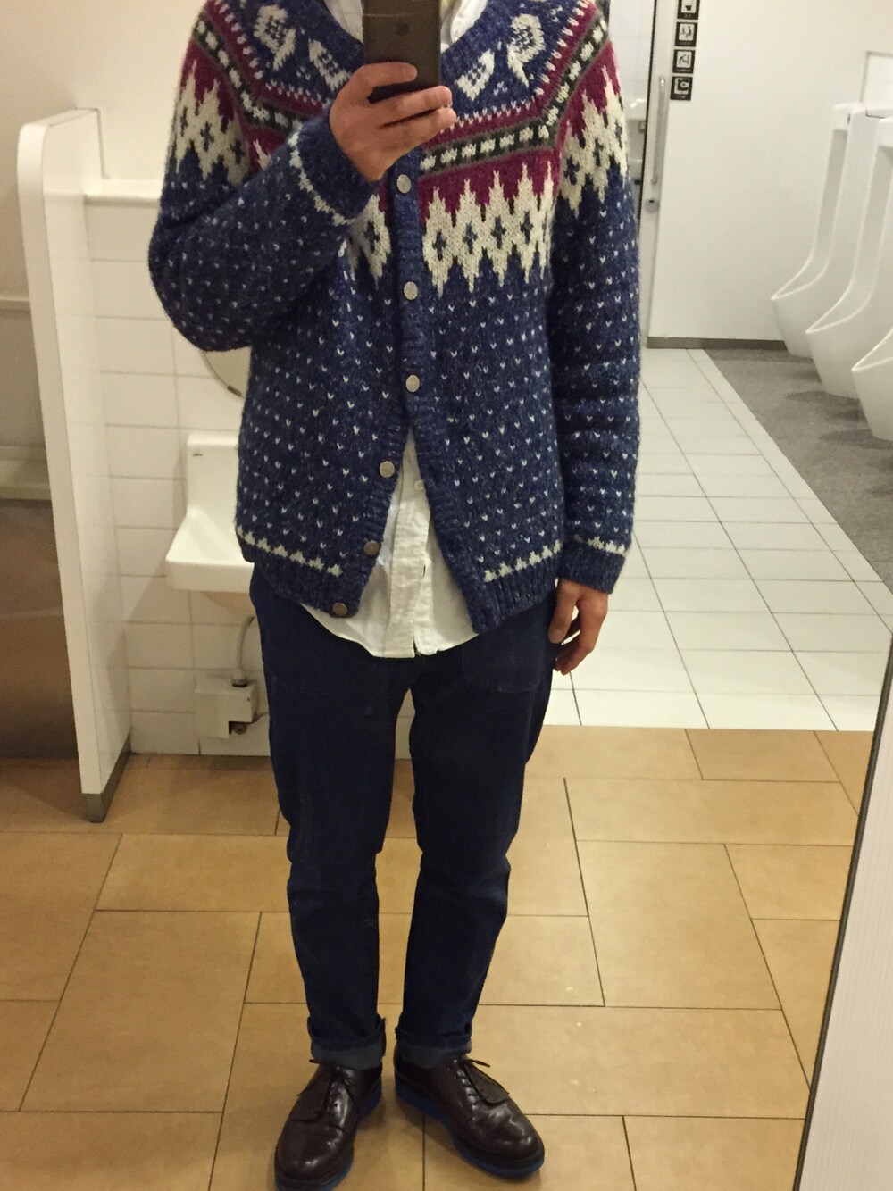 オール古着コーデ。 全身真っ青(笑) 見えてませんが、ニット帽はダークグレー、靴は相性の良い茶色の革靴。 古臭く、野暮ったくならないよう、色味やシルエットに気をつけました。