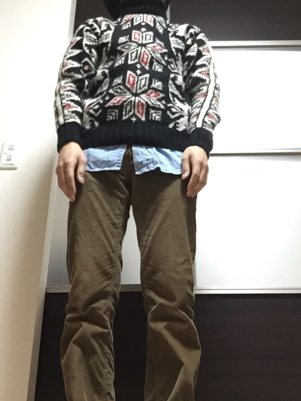 全身古着第二弾! ローゲージのニットにコーデュロイというがっつり冬コーデ。 デニムシャツをセーターから見せて、上下をくっきりさせたのがポイントです。 土臭い感じですが、黒ハットと革靴でしめました(また見えてない)。