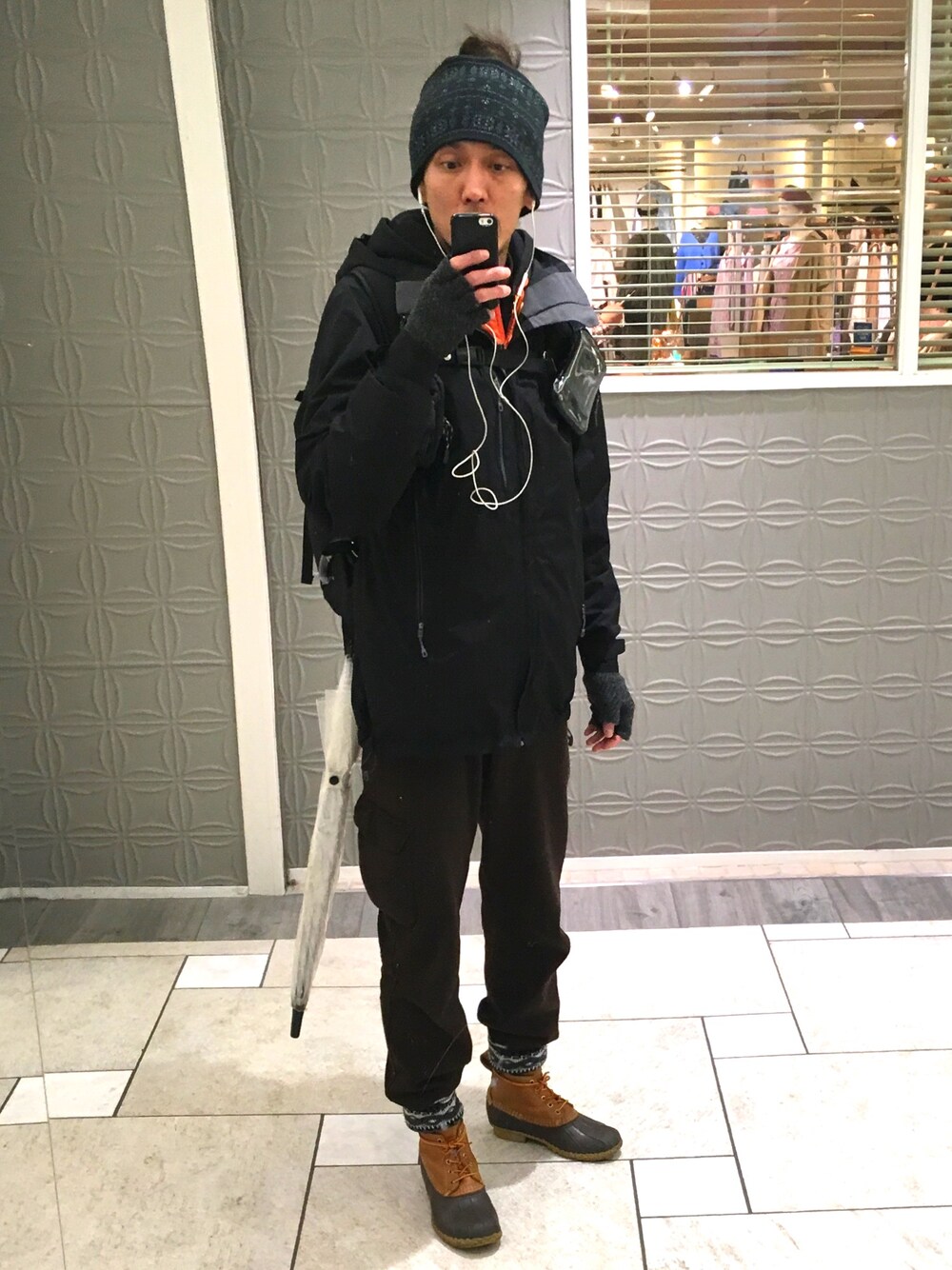 雨の日なので最近定番のパタゴニアのGore-Texナイロンジャケットとビーンブーツの組み合わせ☔️ 全体的に暗めの色だったので、ヘッドバンドをペイズリーとソックスはノルディックにしました🌟 そしてインナーのベストはオレンジ🍊