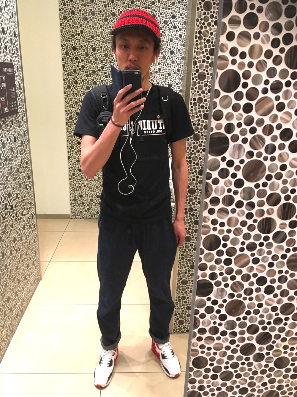 今日はstudio oneのTシャツが着たかったので、Tシャツの黒に合わせた🌟 スニーカーと帽子に赤を入れて、暗くなり過ぎないようにした✨