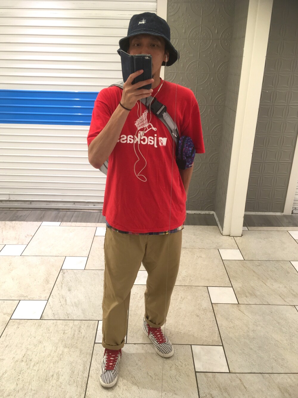 またまた登場のjackassTシャツ🌟 今日は90年代なコーデにしました✨ 色使いは赤、ネイビーとベージュの鉄板の組み合わせ‼️