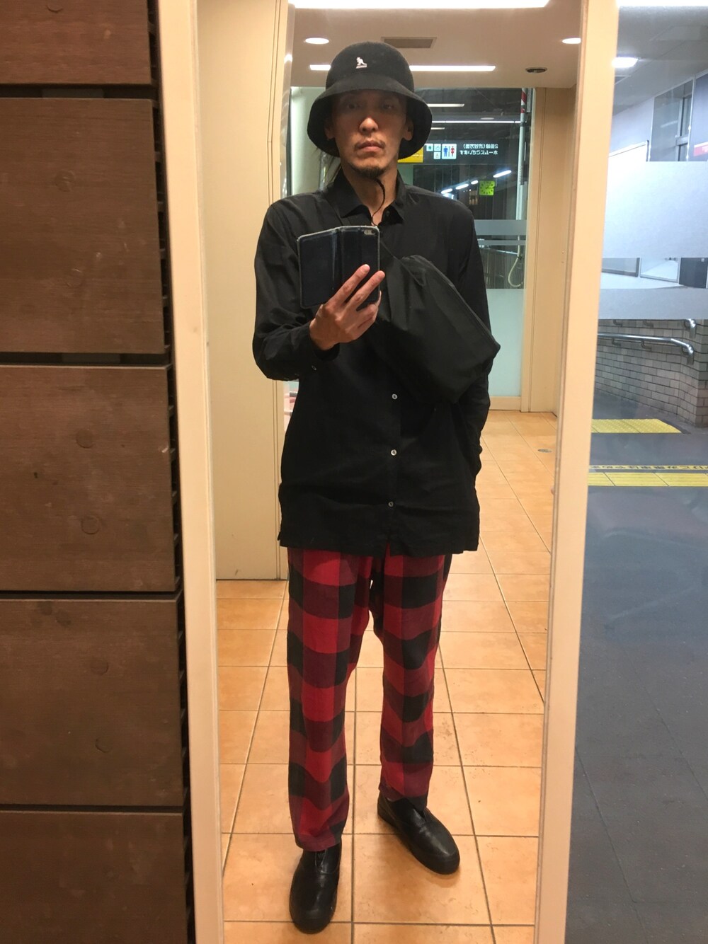 今日はブラック‼️ だけにしようかと思っていたけど、パンツに赤を入れたチェックパンツにしました🌟 季節的に色は少し重い印象ですが、シャツもパンツも素材を麻にして軽さをだしました🌞