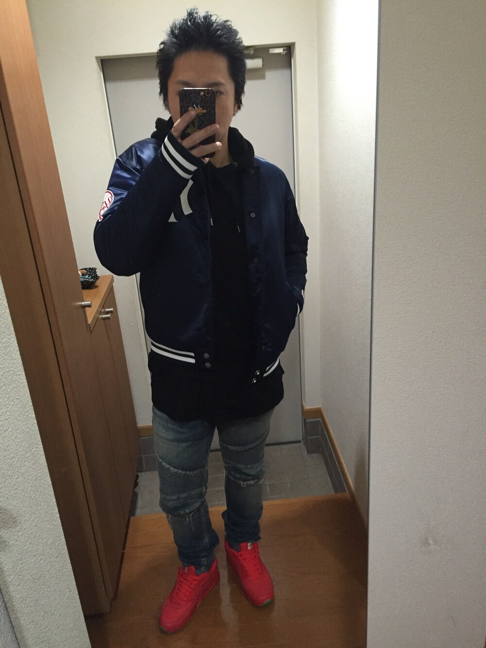 こんばんは✌️ 今日はNYヤンキースのナイロンジャケットに青系のコーデに赤のエアマックスを合わせてみました❗️ 今日も寒いですが、パーカーなどの重ね着でヘッチャラでーす😆