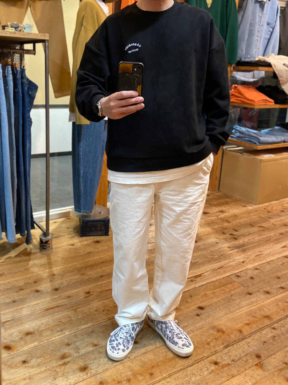 《NEW WORK》 オックスフォードの100%COTTONのシャリ感がこれからの季節に涼しく愛用できるアイテムです。 ストレートのシルエットが特徴的なイージーパンツです。 洗いざらしのウォッシュドされた素材にハリのある質感がお薦めです。しっかりとした風合いにリラックスした心地良い履き心地をお約束します。 ホワイトの軽やかな雰囲気は足元を変えるだけでスポーティーにもカジュアルにも綺麗めにも対応します。もちろん丸洗いもOKです。 ウエスト部分はドローストリングが装着している為、イージーに着用できます。 後ろのパッチポケットは下目に付いているので、 バックサイドもスッキリとした印象に。 裾は程よいボリュームのストレートタイプ。 サイズ感が良い感じです。 着こなしも様々に色々なスタイルに対応します。 生地感はしっかりしてます。 *同素材のオックスフォードシャツも別売でご用意しております。併せてのご購入もお薦めです。 *着用写真はLサイズになります。 身長172cmの体重70kgです。 BRAND:U.S.boarder COLOR:White SIZE: M , L , XL ○U.S.BOARDER KIXX 京都 京都府京都市中京区東大文字町292 寺町詩の小路 1F ☎︎075-213-4630 *阪急電車 京都河原町駅 9番出口から徒歩3分です。 『We are U.S.BOARDER』 アメリカンカジュアルを基調とした商品デザインはシンプル且つベーシックをコンセプトに商品展開しております。日本国内のオリジナルブランドです。