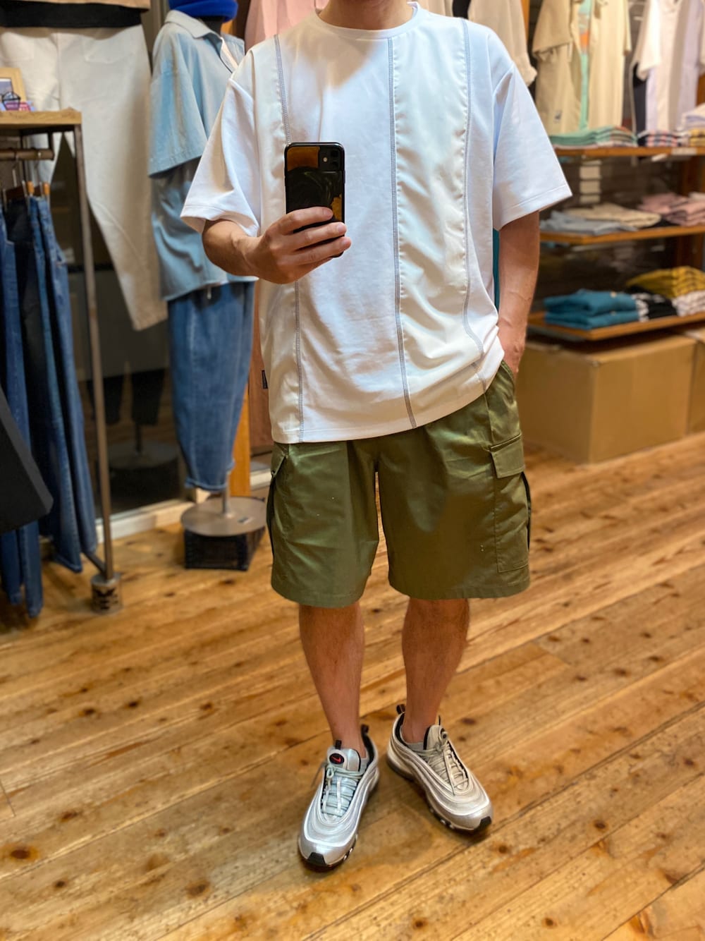 《NEW WORK》 おはようございます。 ご覧いただきありがとうございます。 新作のカーゴショーツが入荷しました。 コットンナイロンのシャリ感が心地良く、さらにスパンデックスの伸縮性が特徴的です。 光沢のある質感がスポーティーな着こなしに。 ウエスト位置による丈感がポイントです。 ツータックの緩いシルエットが今季スタイル。 膝上の丈がお好みの方にもお薦めです。 ワタリとボトムに余裕があり、股上がスッキリしている為、緩いシルエットながらもルーズになりすぎず、コンパクトに纏まります。 サンダルとの相性も抜群です。 ウエスト後ろ部分がゴム仕様になっている為、イージーパンツみたく伸縮性がございます。ドローストリングにより、大きめでもベルト無しで着用できます。 シンプルながらも機能性に優れたアイテムです。 今季はタックインでハイウエストな着こなしも◎ 着用はトップスXLのボトムスMサイズでございます。 身長172cmの体重70kgです。 BRAND:U.S.boarder COLOR:Khaki SIZE: M , F ○U.S.BOARDER KIXX 京都 京都府京都市中京区東大文字町292 寺町詩の小路 1F ☎︎075-213-4630 *阪急電車 京都河原町駅 9番出口から徒歩3分です。 『We are U.S.BOARDER』 アメリカンカジュアルを基調とした商品デザインはシンプル且つベーシックをコンセプトに商品展開しております。日本国内のオリジナルブランドです。
