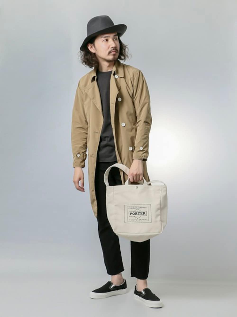Tシャツonトレンチコートスタイル。コート以外は全てモノトーンで統一しています。バッグはTRAVEL COUTURE by LOWERCASEの吉田カバン(PORTER)製バッグ。問い合わせ数、予約数ともに今期圧倒的1位の人気アイテム。在庫争奪戦状態になっていますので、ぜひお早目にご予約を。