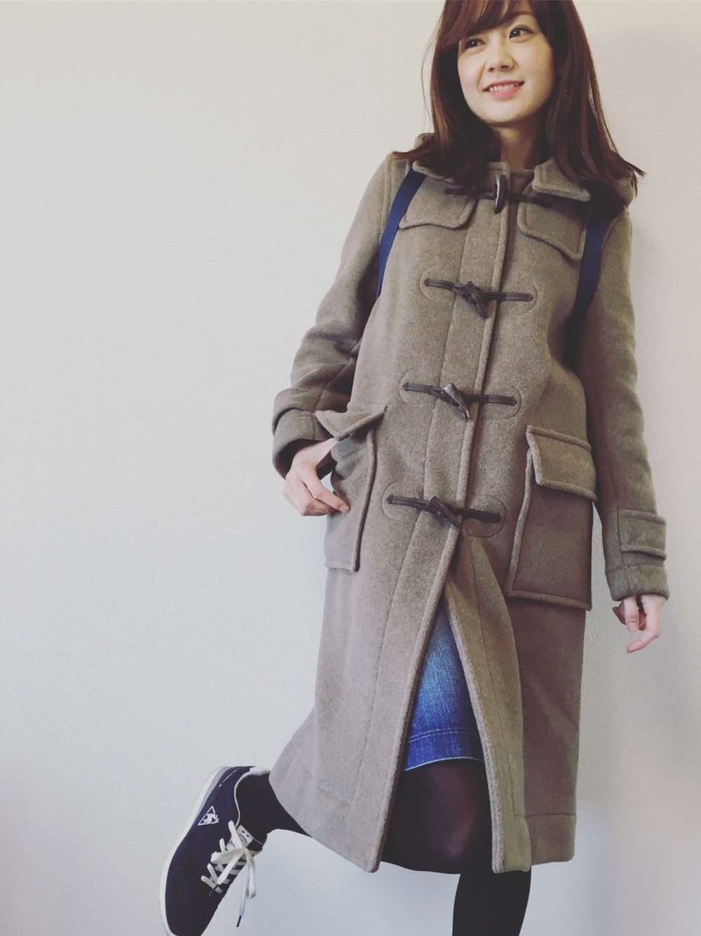 ロングダッフルコートにスニーカーでカジュアルダウンなスタイルに。