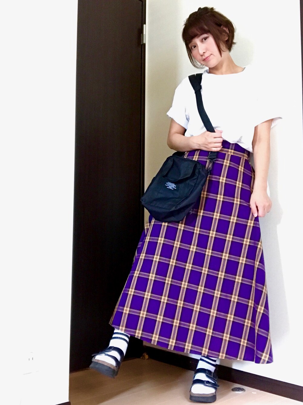 今日はサッカー観戦行く予定⚽️ 少しスポーツテイストいれてみました。 GUでずっと悩んでたスカートが590円笑笑 迷わず買いに走りました! ポケットついてるしシルエットもキレイ(о´∀`о) 紫チェックスカートってあまりみないからかなり挑戦☆ とりあえずモノトーン合わせ。