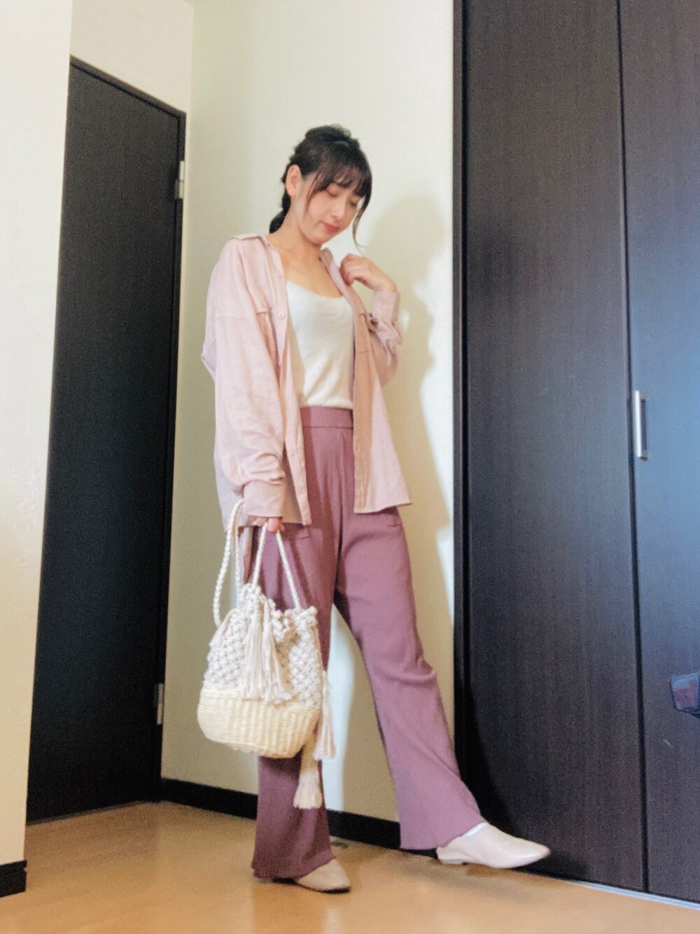 暑いのか寒いのかジメジメは嫌だなぁ。 タンクにシャツ キャミにシャツ合わせが最近すき。 パンツはピンクがかったブラウンなのでピンクシャツと合わせやすいです。
