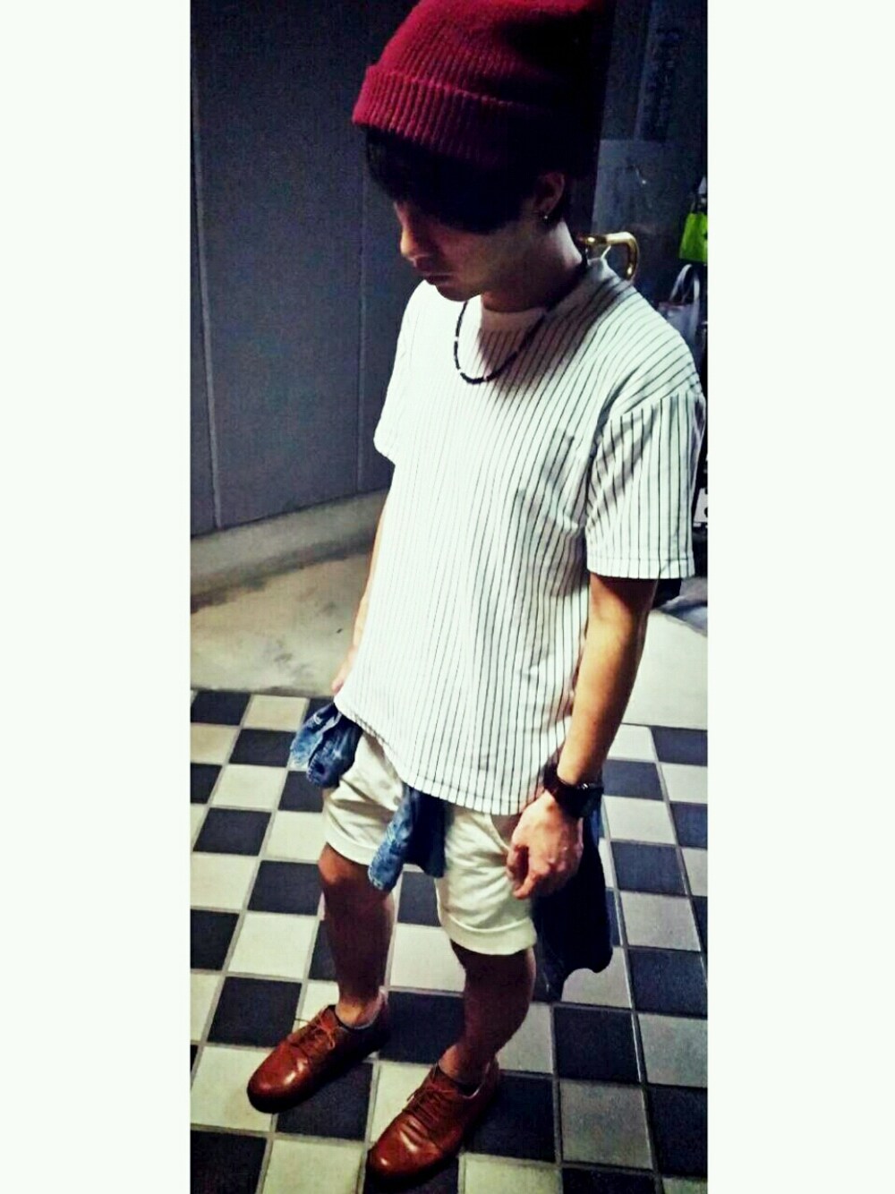 ツバ広ハットに続き腰巻きもヘビロテ中です!ビーズネックレスもお気に入り✨ 今回はニット帽にストライプTシャツでスポーツMIXっぽいつもりだけどちょっと弱いかな😣今年はとにかく白のショーパンを穿くことが多い🎵