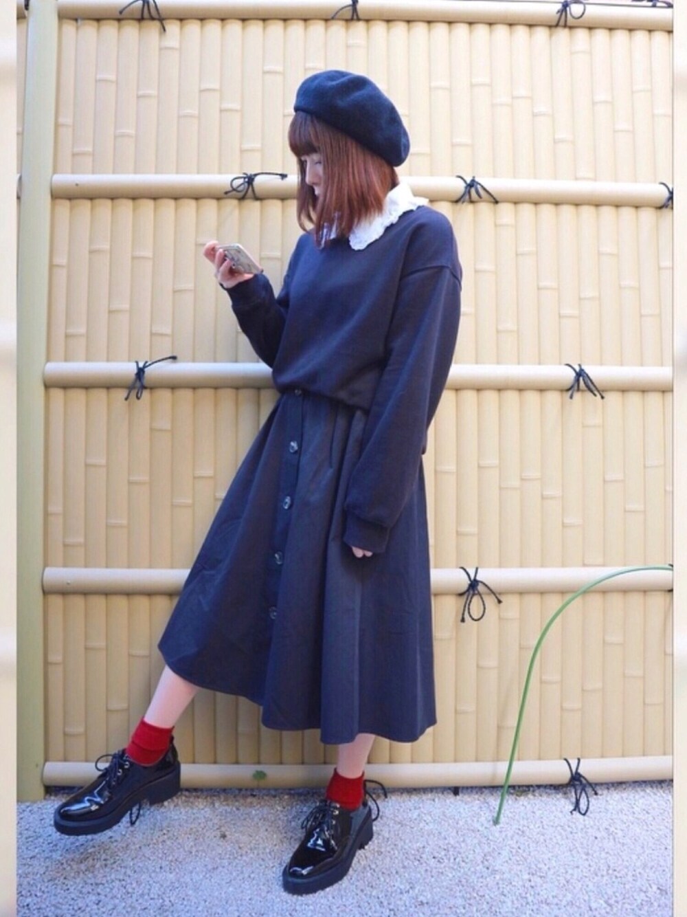 GU プチプラ コーデ 。 オールブラックにしようとしたけど 、 つけ襟つけて 、靴下は赤 🥀 スウェット暖かいし 、 合わせやすくてとても使える ◎