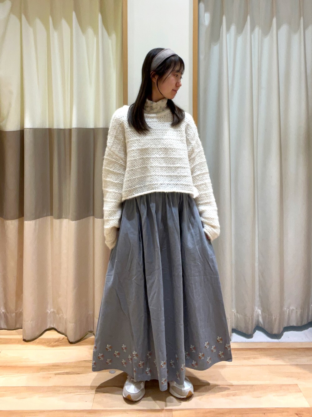 おはようございます- ̗̀ ☺︎ ̖́- いつもご覧いただきありがとうございます! マカベアリスさんコラボのスカートコーデ🐿🌷➰ ニットの中には前回着用していた ベア天の雪柄を重ね着させました✨ 📣 本日冬物新作アイテムが 再値下げと大変お買い得☺️✨ 日中からすぐ活躍できる秋物は全品半額と お求めやすくなっております◎ 是非ご来店お待ちしております✨