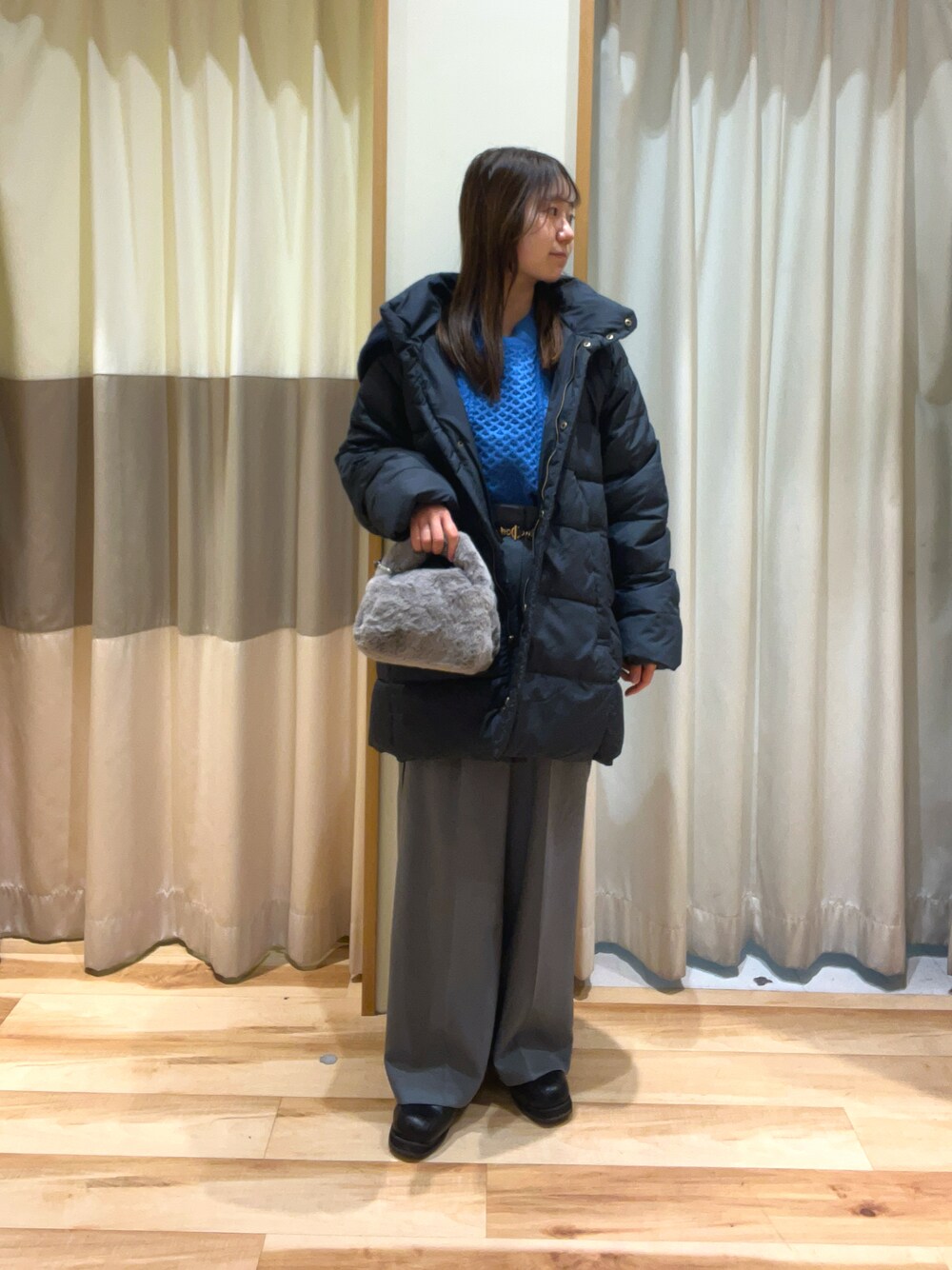 おはようございます- ̗̀ ☺︎ ̖́- いつもご覧いただきありがとうございます! 前回着用したコートは色違い、サイズ違いを 着用してみました✨ ※前回着用色…ライトベージュ、Mサイズ 今回着用色…ネイビー、Lサイズ ⇒2枚目にコート中に入ったドローコードを 絞ったシルエットも載せています◎ Lサイズの方が袖や後ろの丈感が気持ち 長めでチュニック感覚で着用できます! お袖はコンパクト目、着膨れしにくい 落ち感のあるスッキリシルエットです✨ 📣💬本日新作冬物が再値下げ!! 冬物も最大半額⛄️㊿ 遂に小物も一部30%off!🛍️ しば。🐶着用のニットは¥1980、 アウターは¥5940のどちらも期間限定 プライスでお求めいただけます✨️ ぜひこの機会にご来店お待ちしております✨️