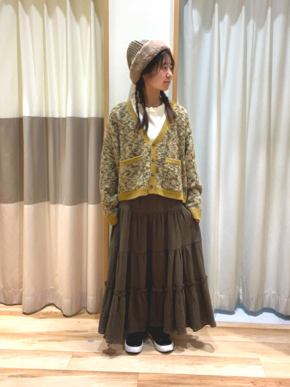 おはようございます- ̗̀ ☺︎ ̖́- いつもご覧いただきありがとうございます! イチョウが見頃になってきましたね🍁🍂 銀杏のような色味のカーディガンを 取り入れた秋コーデです! カーディガンはinをしなくても スッキリ見える丈感になっています◎ 今回は綿100%の履き心地抜群の ティアードスカートと合わせてゆるく 着こなしてみました✌️ 📣 今週より冬物新作が再値下げ! 気になってる商品もお値下げになって いるかも…?!✨ この機会に是非ご来店お待ちしております🐶🚪