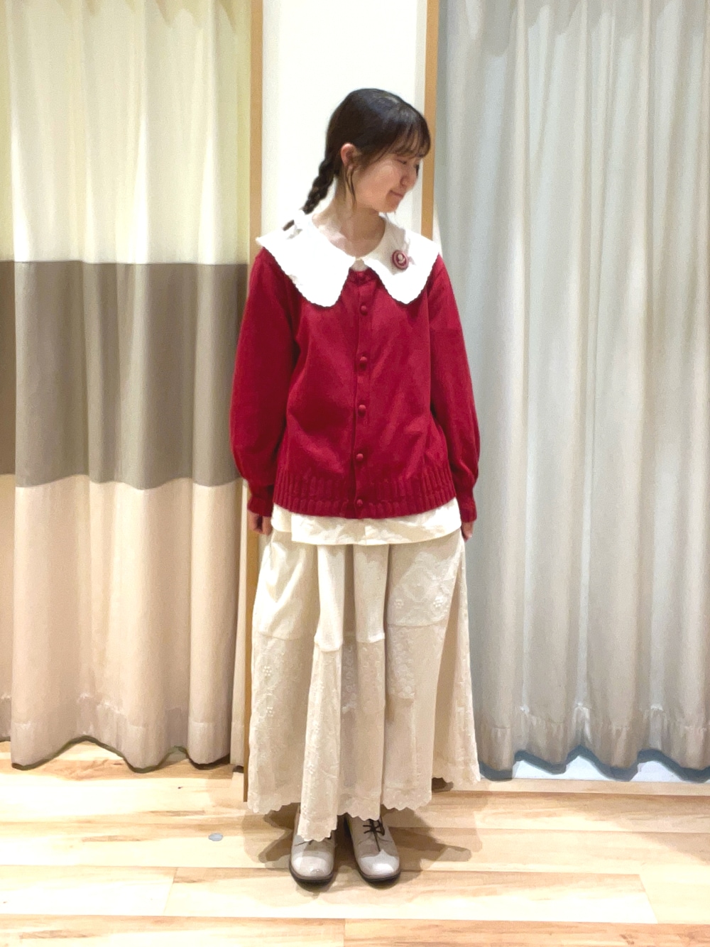 こんばんは🌙 いつもご覧いただきありがとうございます! 最近の出勤コーデ👜♡ 上下色味を揃えてセットアップ風で 着てみました☺️ スカートはパッチワークレースがさりげなく 入っていてとてもオシャレ✨ 高身長さんはワンピースと一緒に履くと 裾レースがチラ見えして可愛いので オススメです🙆🏻♀️◎ ゆべしさんコラボは カーディガンはレッド以外はご用意あり 残りわずかとなっております…!💦 気になる方はお早めに…!