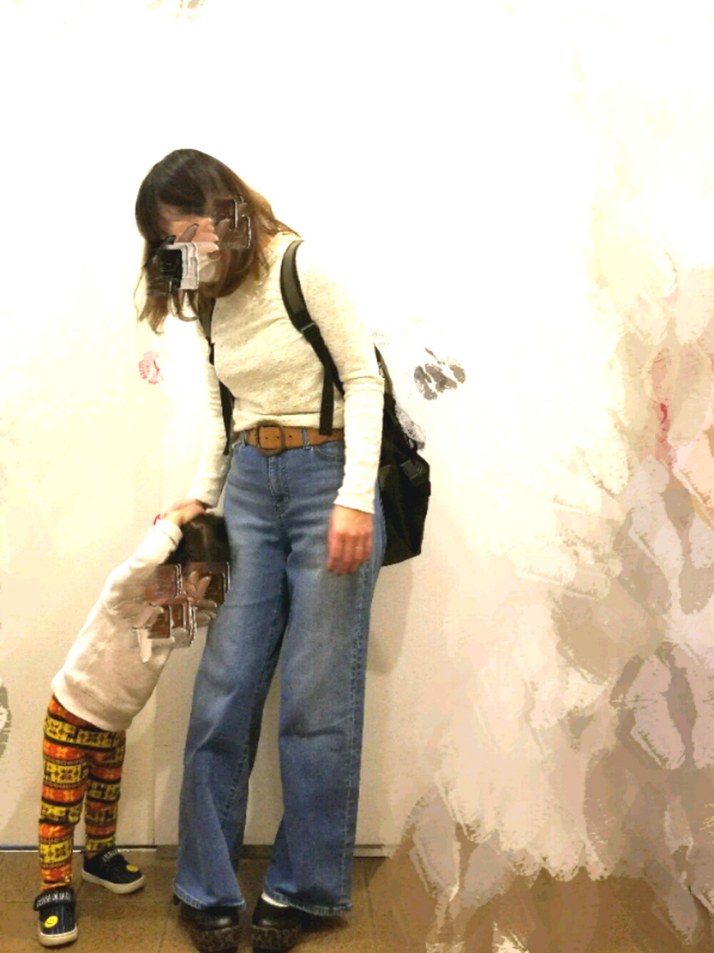 こんにちは🌸 頭を抱える息子👶🐒 今日は暖かいので、レーストップスにベージュ系のシングルライダースで春コーデ👕👖