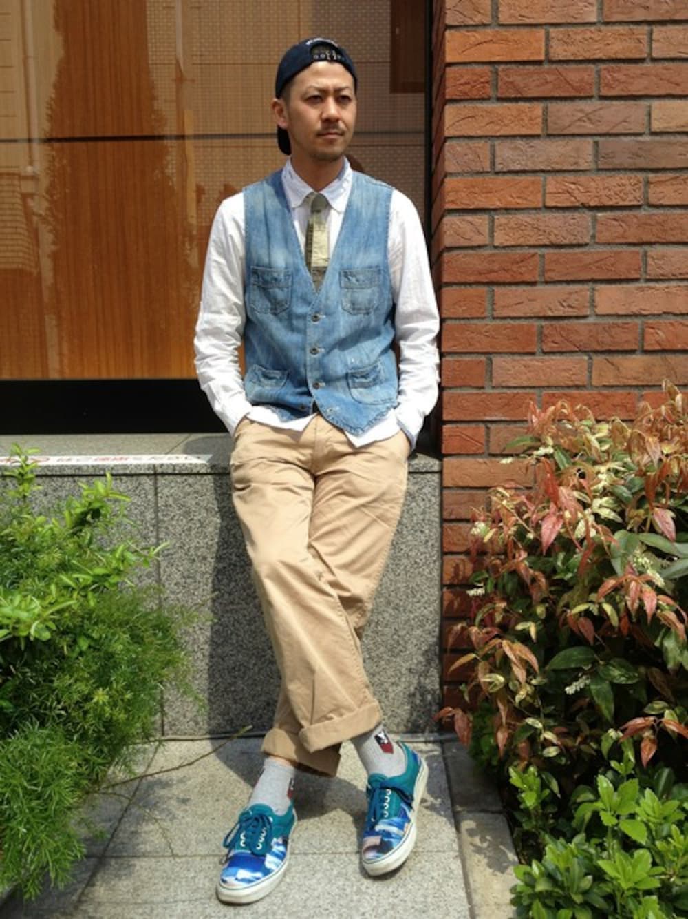 シャツにネクタイとリメイク物に定番チノで合わせてみまさした♬ 足元はスニーカーで^_^
