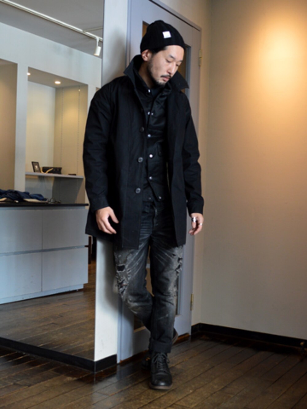 頼りがちなオールブラックコーディネートはレイヤードするアイテム、素材感でメリハリを。 インナーに合わせたベストがポイントです。
