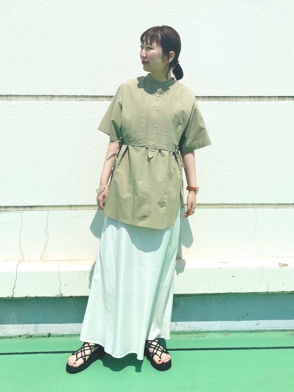 レイヤード風デザインのシャツ🌱 1枚でサラッと着てもオシャレ感が プラスされますよ〜 トップスをメインに スカートはシンプルに合わせました☺️