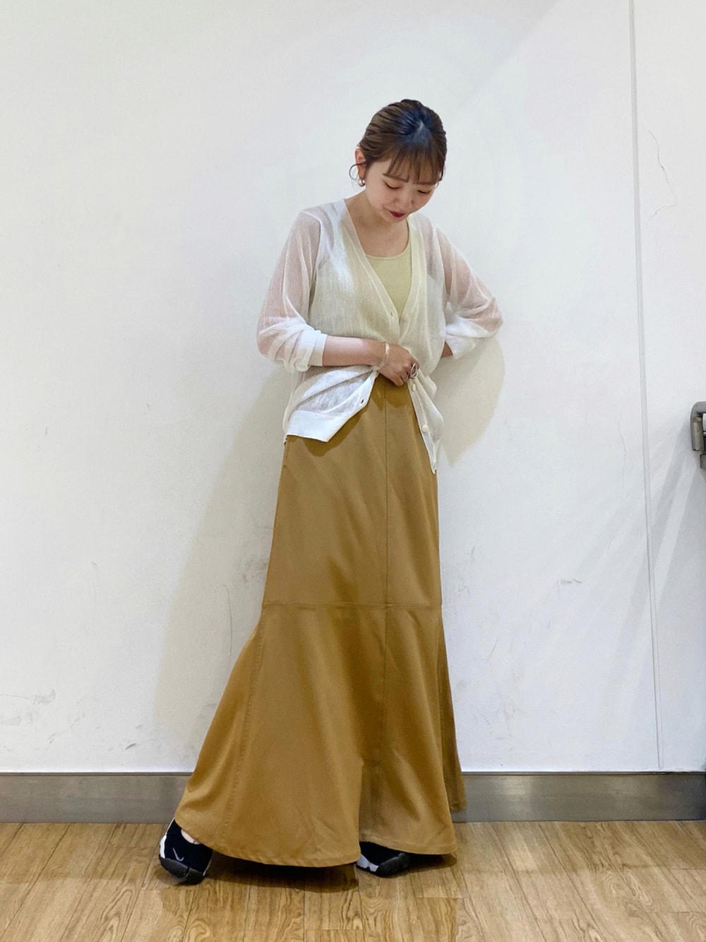 マーメイドラインのシルエットが 綺麗なスカートです👌🏻 シアーカーデと女性らしく合わせて エアリフトでカジュアル感もプラス。