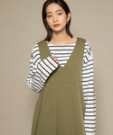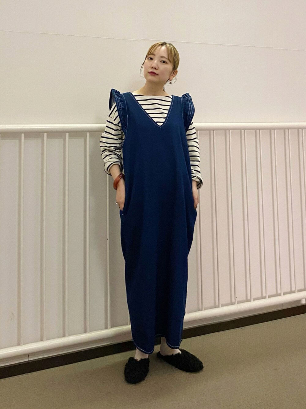 人気のフリルデニムワンピース 待望のSサイズも入荷しています〜🤲🏻 わたしの身長で踵が出る程の長さ! スッキリと見せたい方にオススメです🌈 フリルで可愛らしくなり過ぎないよう ボーダーTでカジュアルに◎