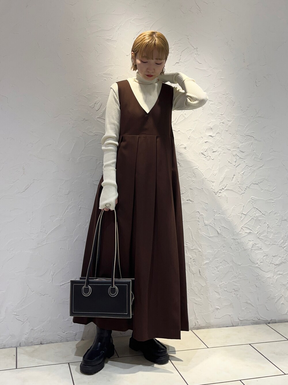 毎年人気のジャンパースカート🥨 ハイネックニットとのシンプルコーデ🤲🏻 小物は黒で統一感を◎ Instagram ⇒ @mmm_iz_