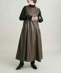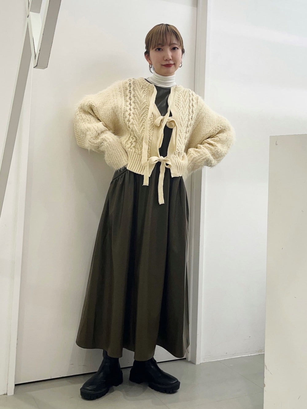 冬らしいふんわり素材のカーデ🧶 リボンデザインが女性らしい雰囲気◎ レザーワンピに重ねました!