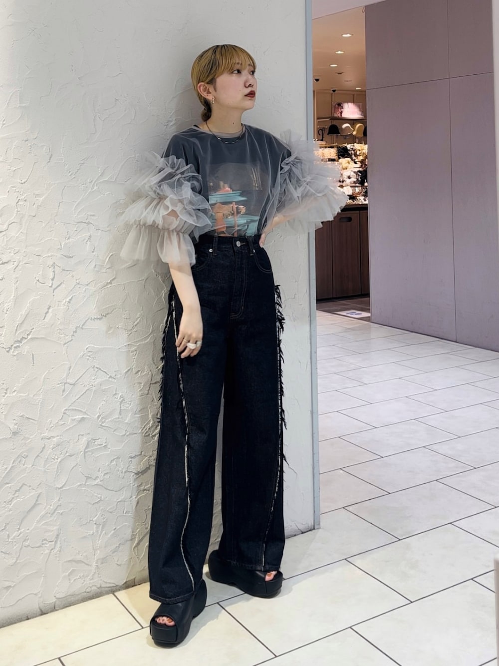 袖のボリュームがかわいいチュールトップス🕊️ Tシャツとデニムでカジュアルに着てみました!