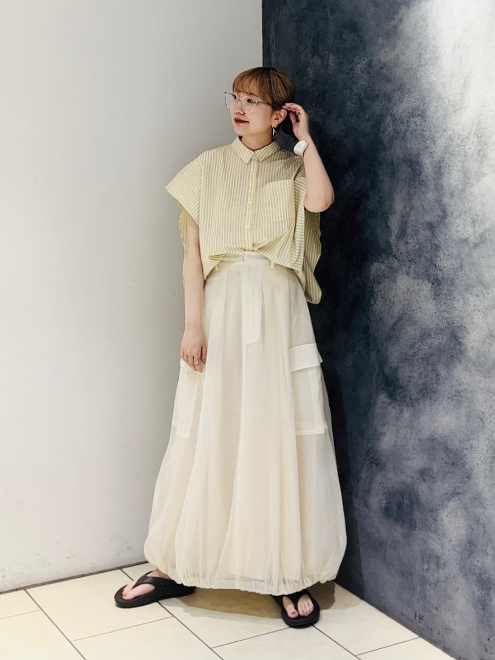 爽やかなストライプシャツ👔 イエローなので柔らかい雰囲気に◎ ふわっとシルエットがかわいい バルーンスカートと合わせました!