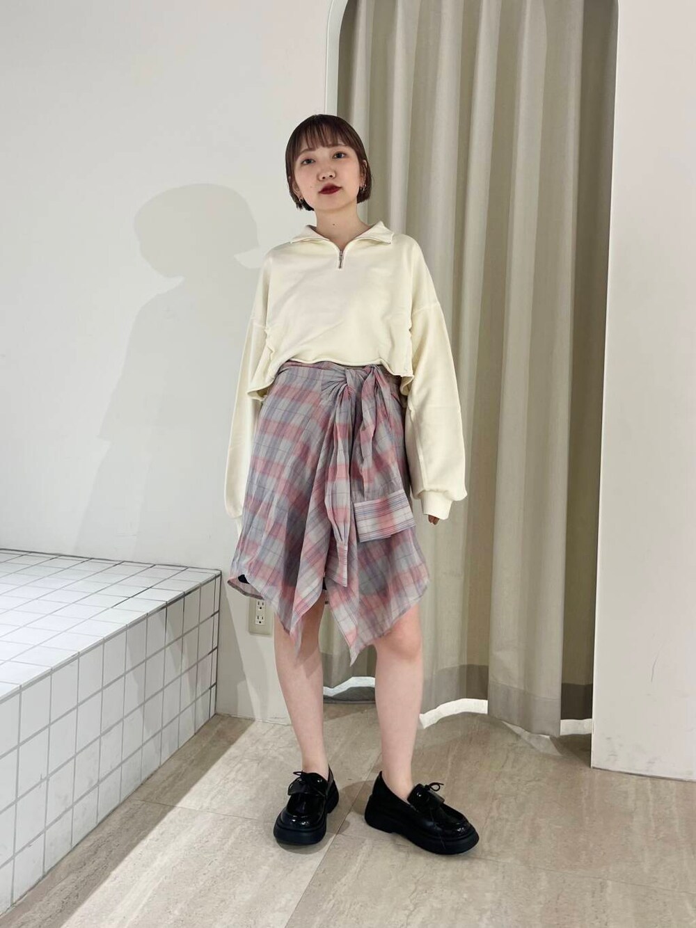 インスタライブご紹介コーデです! 春らしいピンクカラー🌸 おすすめのチェックシャツを腰巻きに◎ スカートっぽく斜めに ひらひらさせた巻き方がお気に入りです☝️