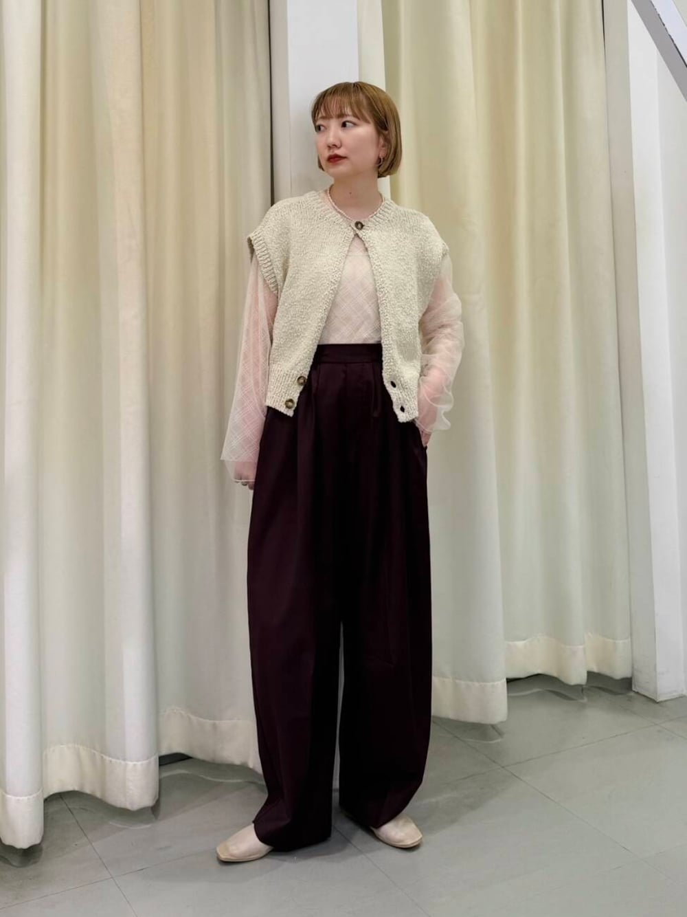カーブデザインがポイントのスラックス。 シルエットを目立たせたかったので トップスはコンパクトにまとめました◎ シアーのインナーを合わせて 今から使えるコーデに😌👌🏻 暑くなったらぜひノースリーブにしても 着てほしいベストです🦺