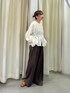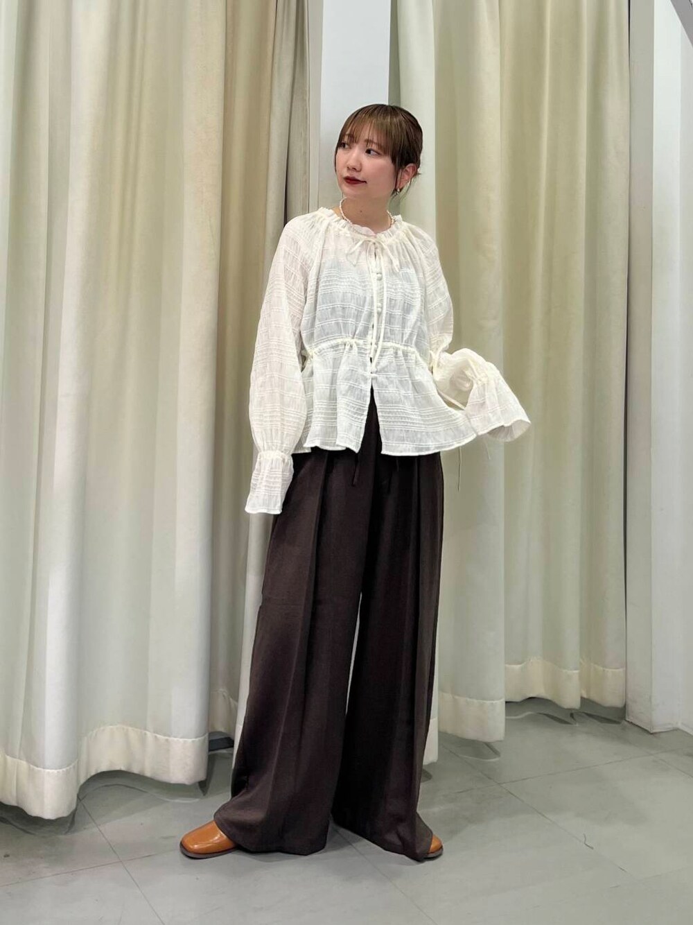 前後2WAYでも使えるブラウス! ふんわりした袖や絞れるウエストラインも ポイントです💡 首元はゴムなのでオフショルで着ても◎ 可愛らしいシルエットなので ボトムはパンツで大人っぽく合わせました。
