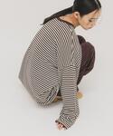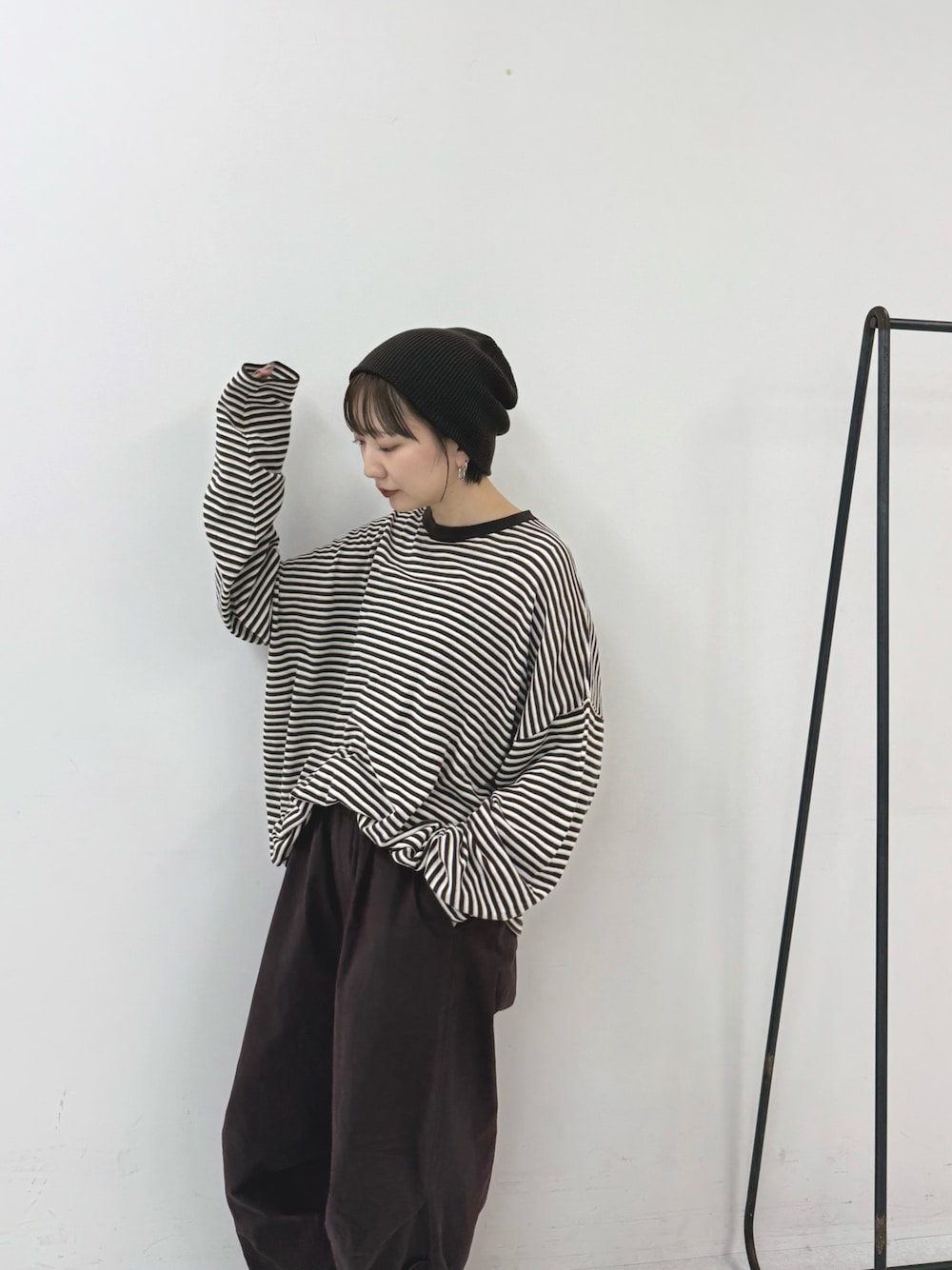 シアーのボーダーニット。 ゆるく着られるシルエットと 着心地の良い素材感がうれしいです🙂↕️ メンズライクな雰囲気で カーゴパンツとビーニーを合わせました!