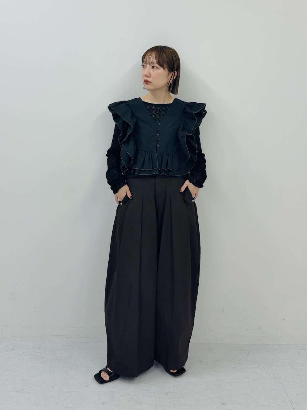 配色メローがポイントのブラウス。 フリルでも大人っぽく着られるデザイン◎ コンパクトな丈感なので ボリュームのあるボトムとも相性抜群です! インナーにはカットソーを入れて 春から取り入れられるコーデにしました✨
