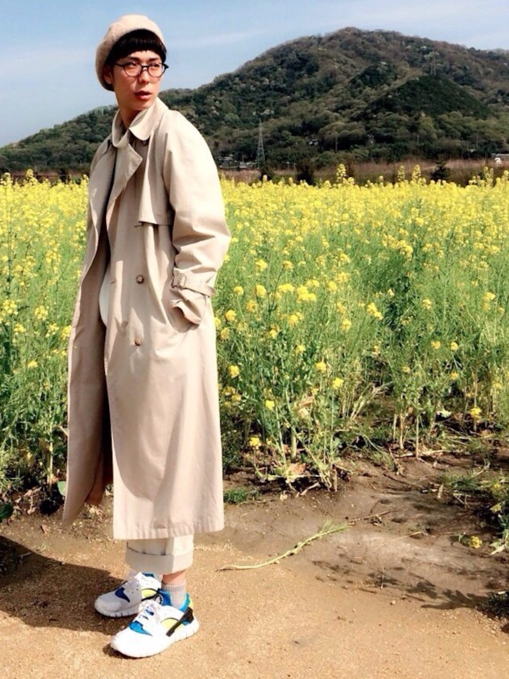 ベレー帽 Ciaopanic ハイネックビックスウェット WEGO トレンチコート USED ワークパンツ STUSSY ソックス UNIQLO スニーカー NIKE AIR HUARACHE 菜の花畑 ひさびさの休日 昨日は 菜の花畑へいってました 一面菜の花で すんごく綺麗でした 鮮やかな黄色を 邪魔しないように 落ち着いた ワントーンコーデ 足元だけハイテクスニーカーで 強めに表現 めちゃくちゃ 楽しかったです 近くにカブトガニ博物館とかあって 恐竜がいっぱいいて テンションあがりました 休日があえば これからも ふたりで いろんな風景を みたいです
