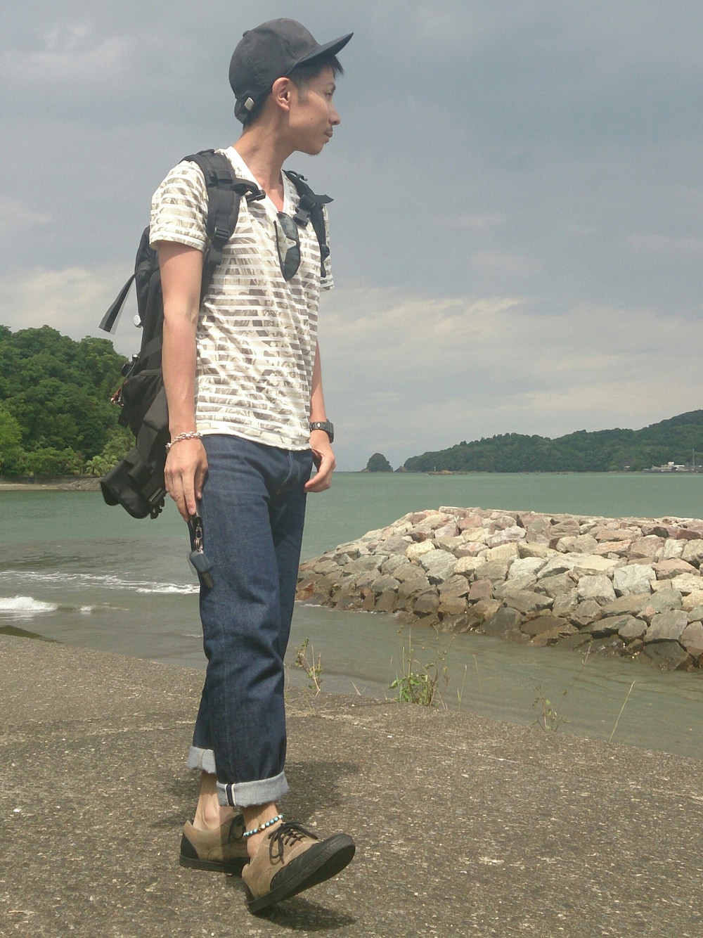 地元の海に来ましたが、あいにくの曇り空 ボタニカル柄のボーダーで、より海辺が似合うテイストになりました。