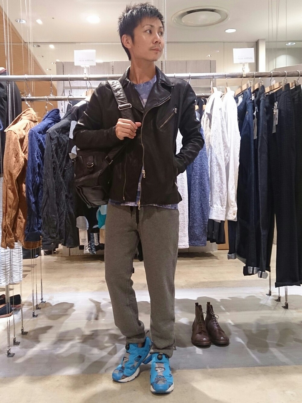 レザー×スウェットパンツのスポーツミックススタイル。 裾リブ付きのパンツなら、九分丈、七分丈と変化自在でオススメです(^^)