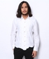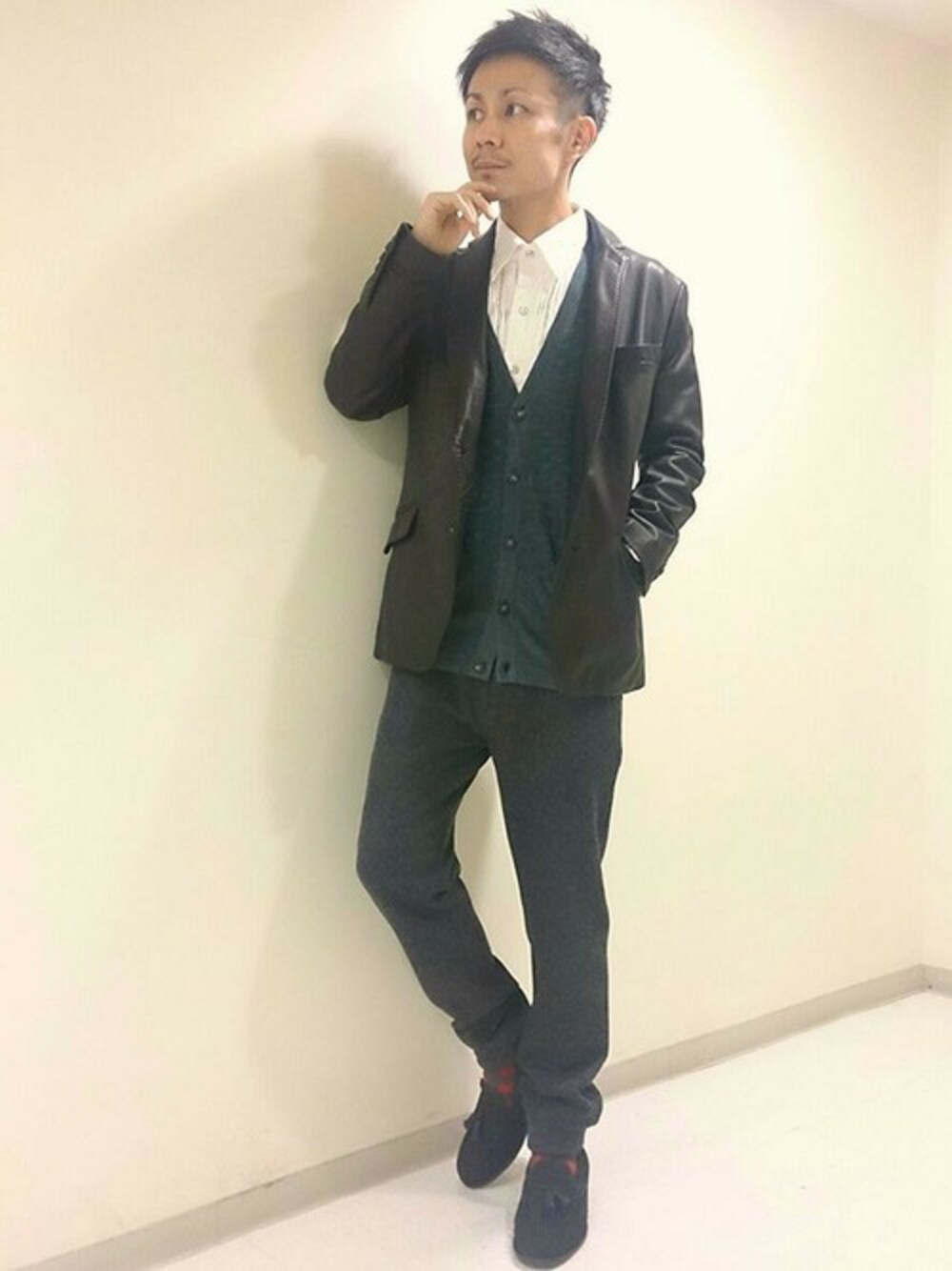 クラシックなタックシャツをトレンドのリブパンツでカジュアルダウン。 ラフになりすぎないよう、レザージャケットとタッセルローファーで引き締めました。