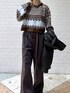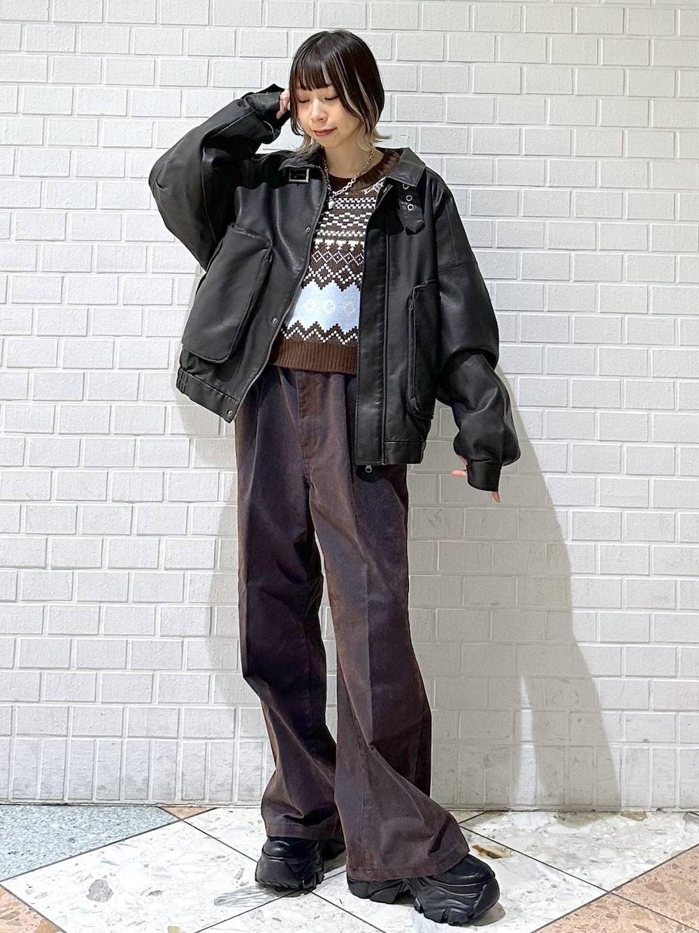 ご覧いただきありがとうございます🫶 【アウター】 色落ち感がヴィンテージ感がありかっこいい!!✨ スタンドネックにもできるので寒い時期まで使えます👌 こちらはSサイズで着用しております! ダブルジップなのでスタイルアップ効果ばっちりです👏 【トップス】 ノルディック柄と配色が可愛いニット🙆♀️ 丈もおへそが出ない絶妙なショート丈で使いやすいです! ワイドパンツやスカートなど特に相性抜群です◎ 【ボトム】 加工感が珍しく、角度によって色味が違って見えます👀 ブルーはブラウンとブルーどちらにも見えます! ゆるっとしながらもフレアシルエットなので脚長効果もばっちりです👍