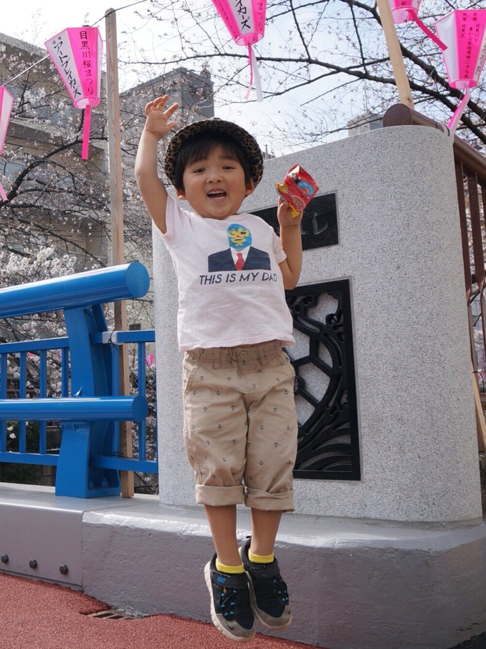 Cherry blossom in Meguro-gawa さすがに一年前のTシャツは小さいか、笑 HATはしまむら TシャツはBEAMS パンツはGU シューズはNike