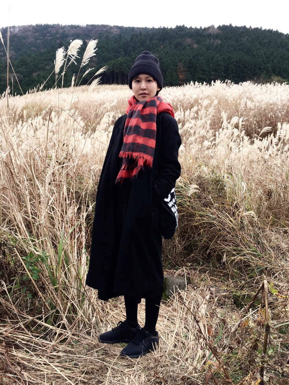 定番スタイル。赤×チェックのマフラーは毎日。三年目突入!物持ちよし。didiziziの。