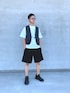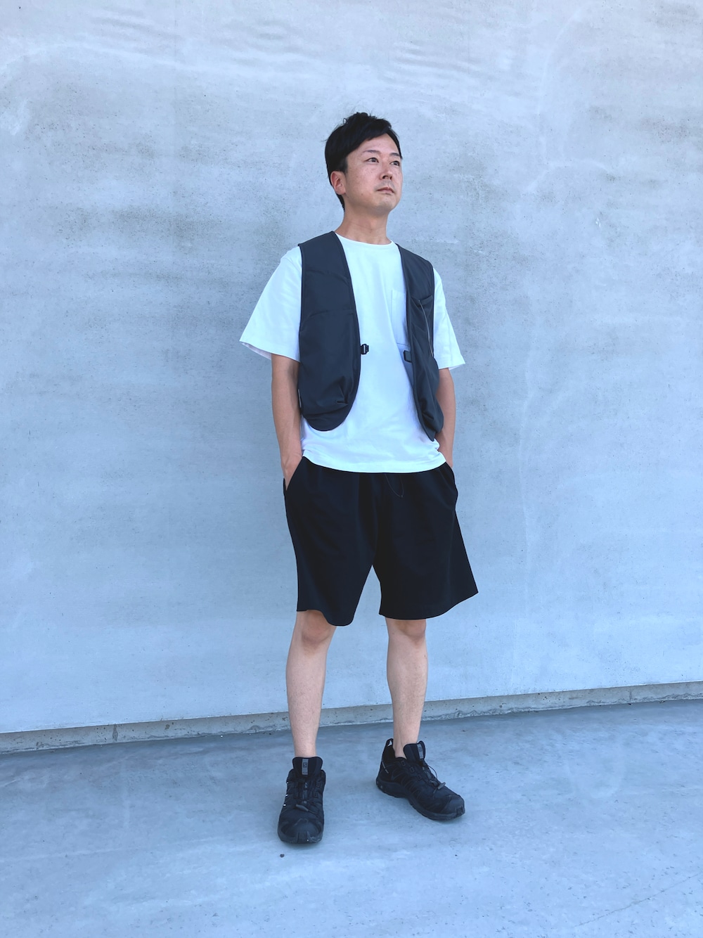 UNIQLO U白TとUNIQLO U ユーティリティベストを使用。 パンツはPENDLETONのセットアップパンツです。