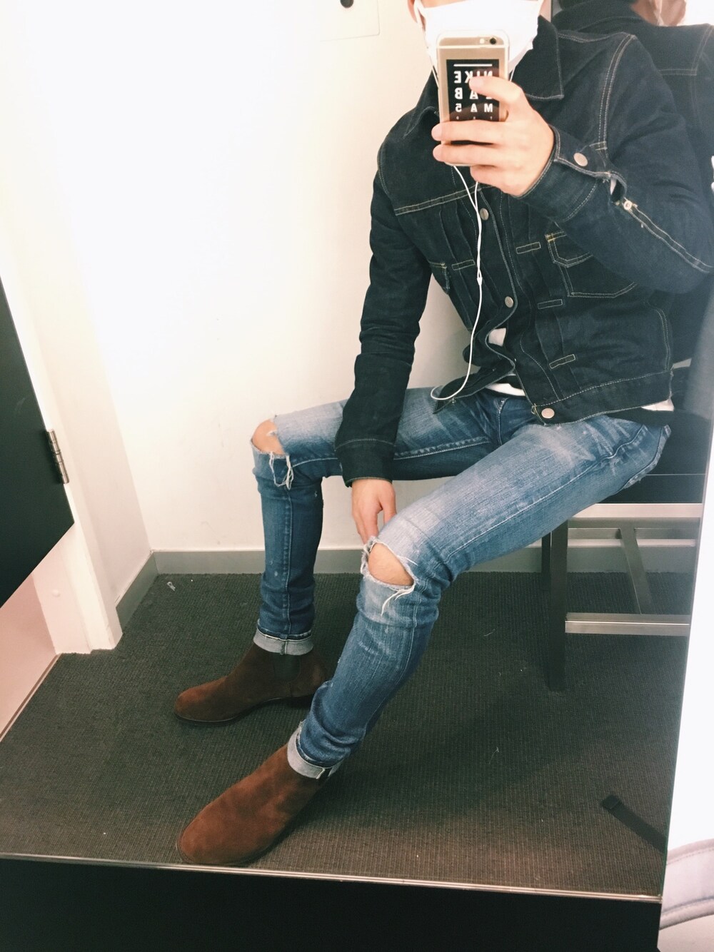 鏡を見ないで今日の服を決めたけど、ジャケットの方が色が濃いと少し変か... ブーツ黒い方がバランス良かったかも... とちょっと反省。。