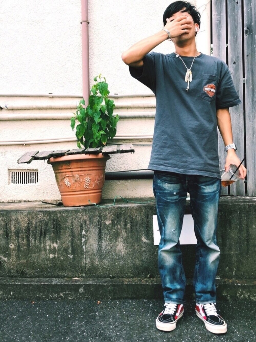 Tops:Harley-Davidson Denim:Levi’s511 古着で買ったハーレーのtシャツがいい色すぎてデニムと相性良すぎ🔥🔥 将来はルイスレザー着てハーレーダビッドソン乗って、20歳になった息子に譲るのが夢。って言えるとかっこいいよね。 ただおじいちゃんになってもかっこよくいたいね。 梅雨が明けてゴローズが映える季節になってきた☀️☀️ ちなみにお気に入りだったゴローズの財布をおととい無くしてここ最近で一番機嫌悪い👎🏾👎🏾 一ヶ月は引きずる予定。