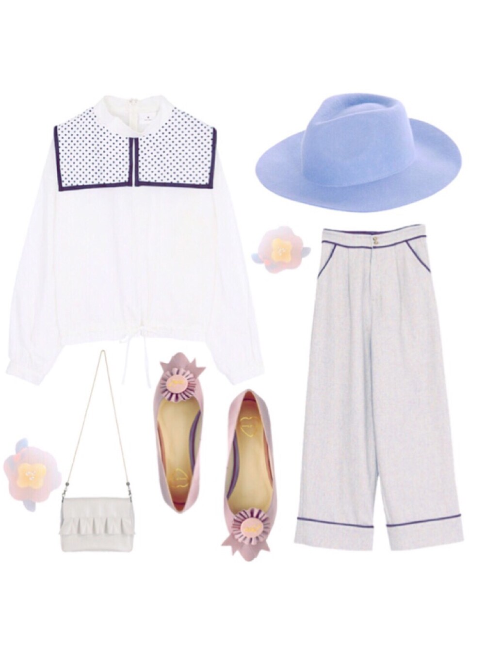 初投稿です◡̈⃝︎⋆︎* merry jenny でつくる春コーデです。 モノトーンにさし色でシャーベットカラーのブルーとピンクを入れました¨̮ 少しレトロなコーデで一人旅なんていかがですか(´-`)♡